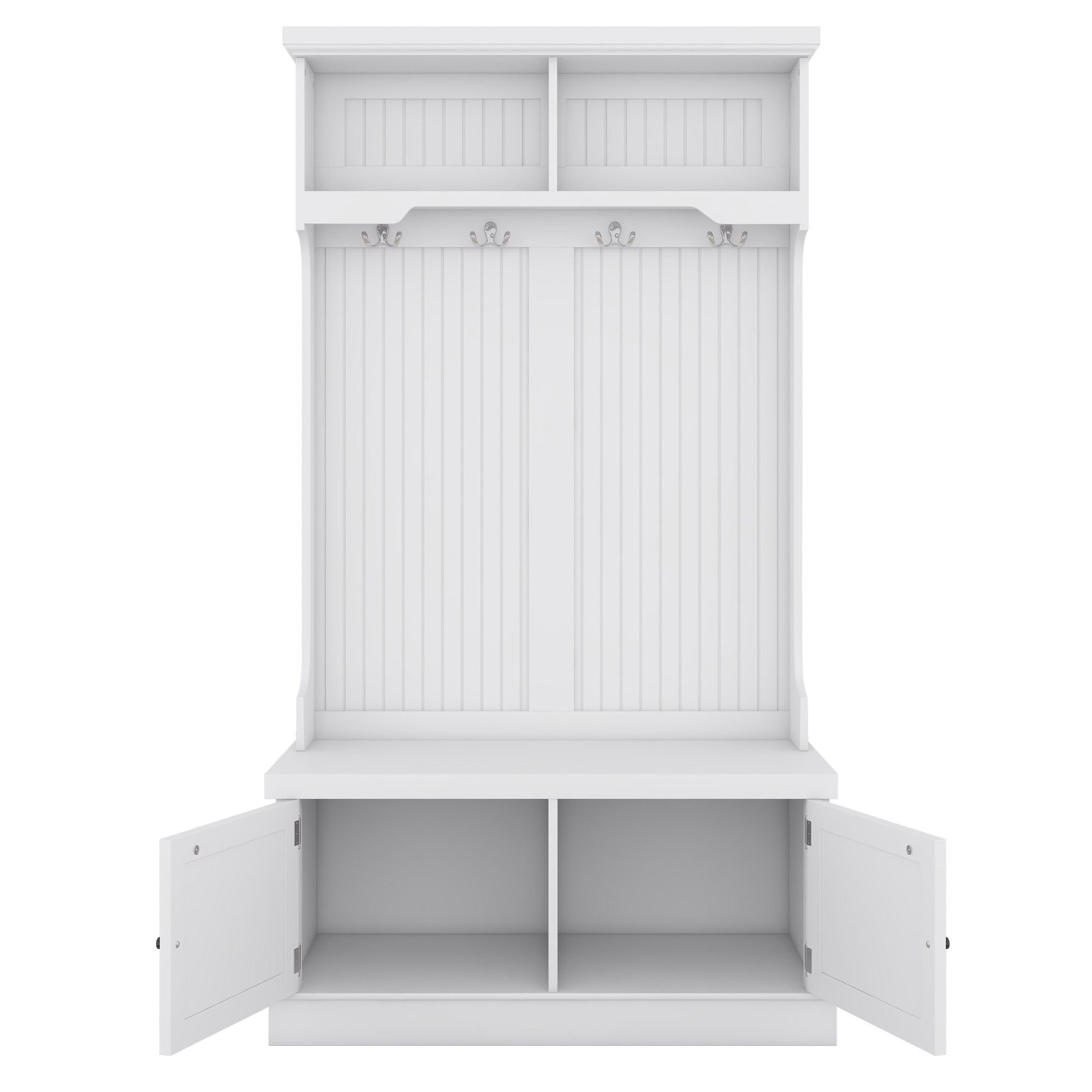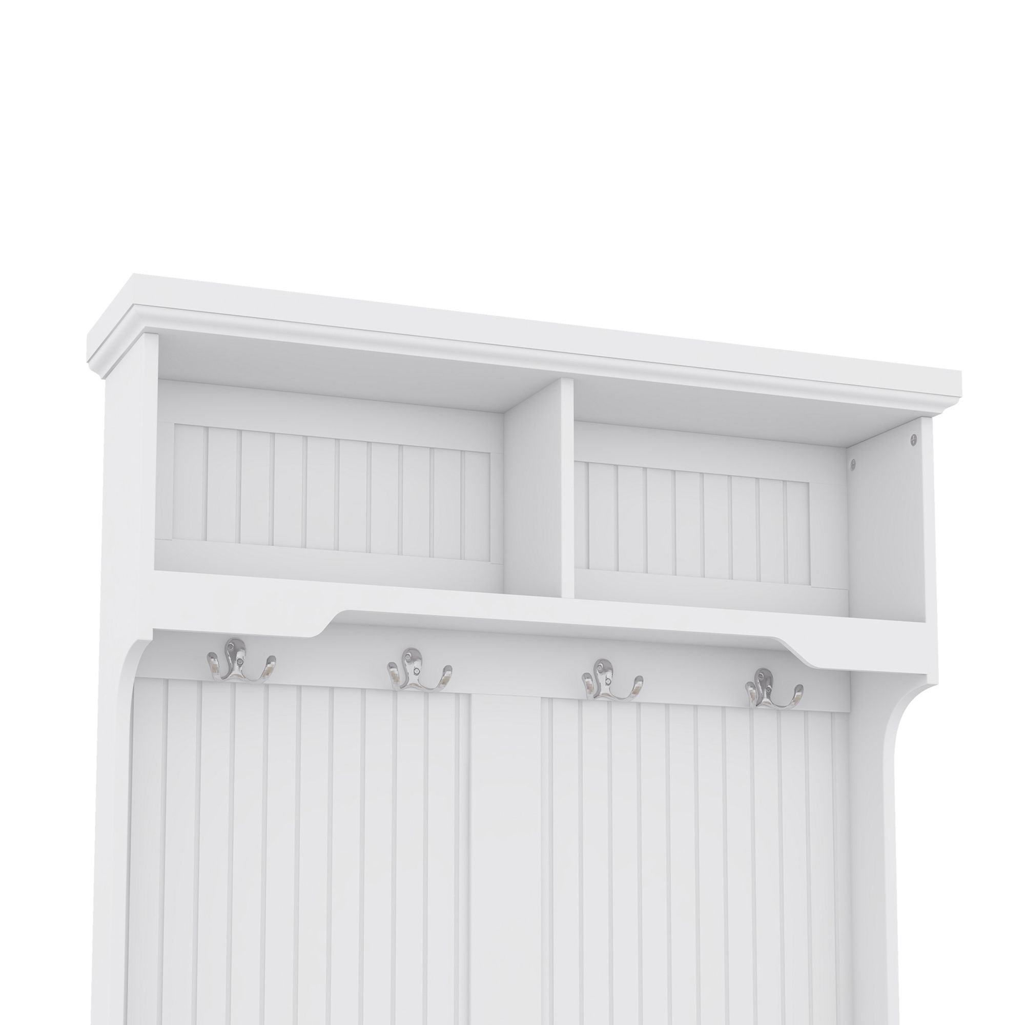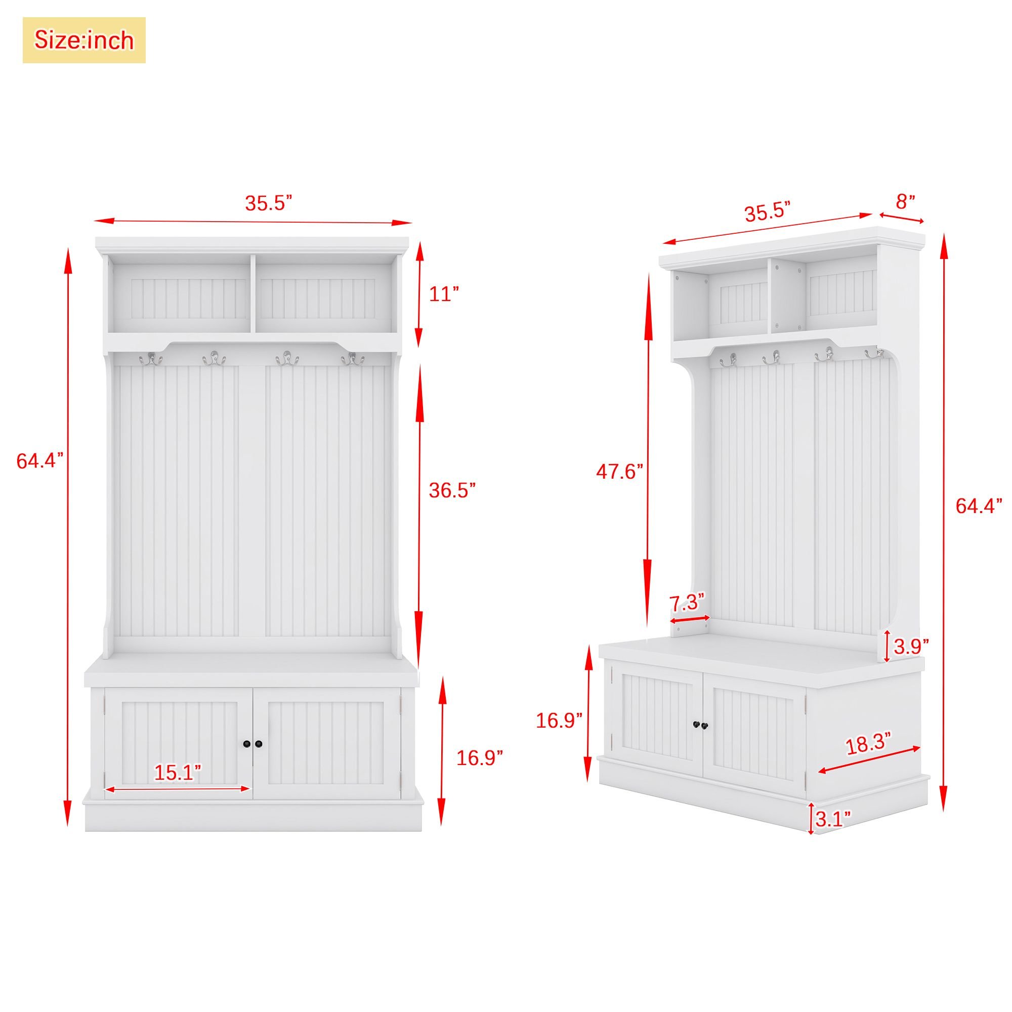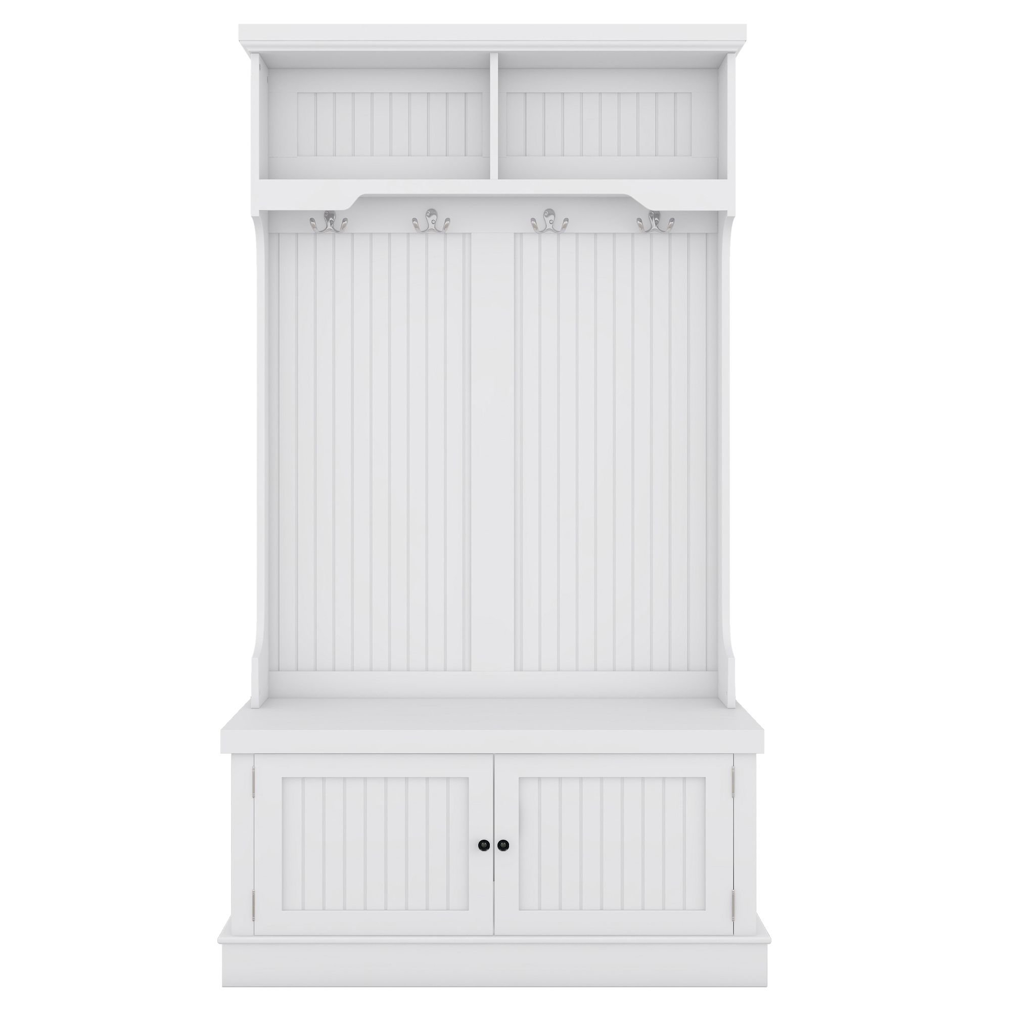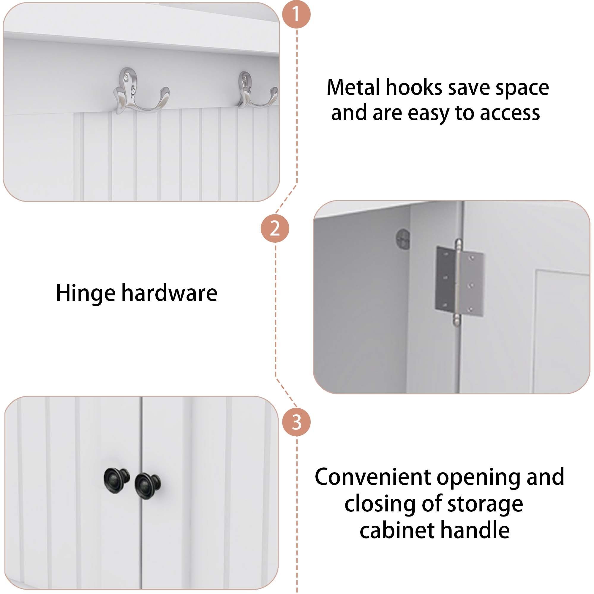 1.4-in-1 Design :This multifunctional hall tree is an Integrated coat rack with hooks, a shoe bench, a storage cabinet, and a display shelf, designed to fit for your entryway, laundry room, closet, bedroom, or mudroom use.