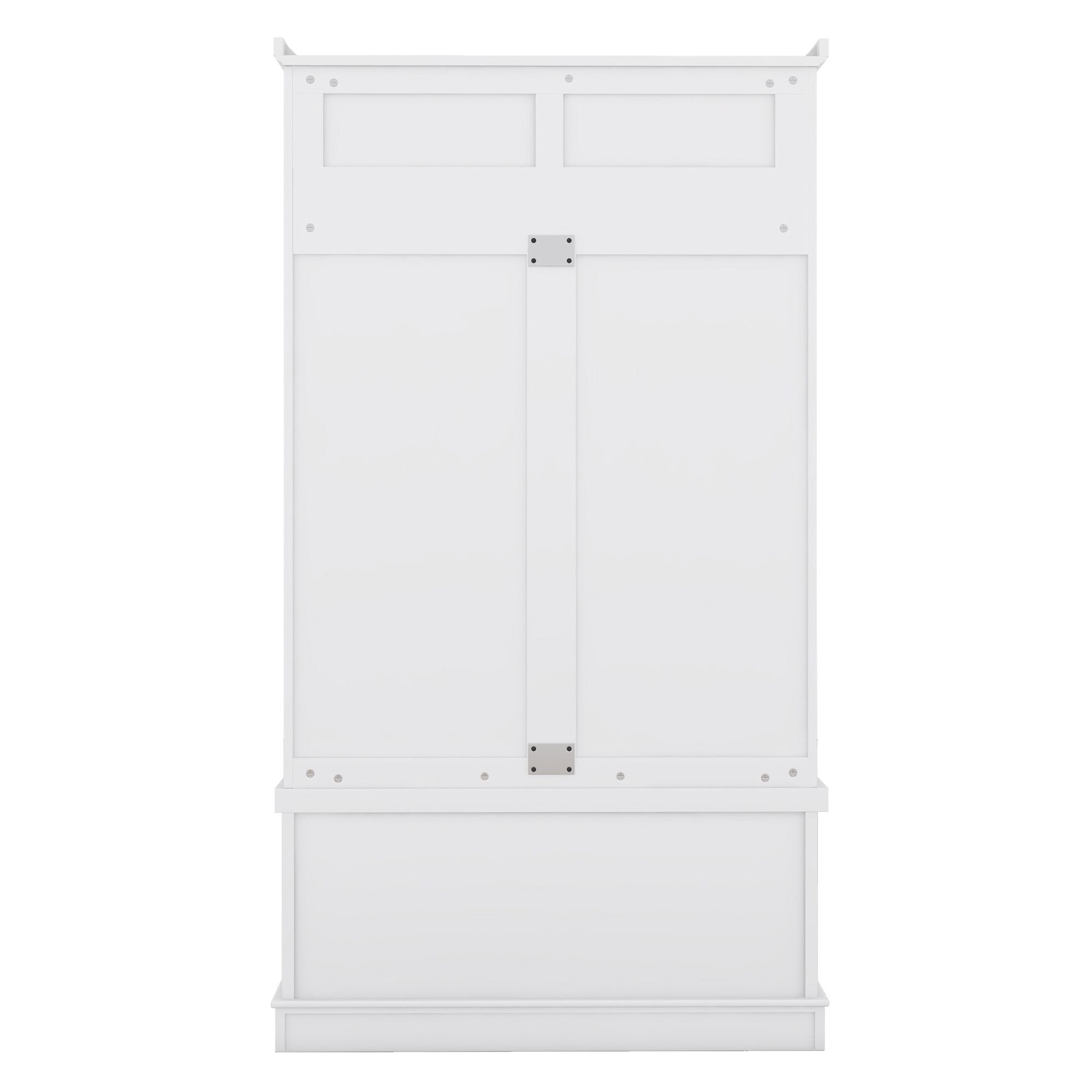 The above two display stands can be used to put family photo frames or decorative objects to highlight your family atmosphere. 4 double hooks are perfect for hanging bags, umbrellas, jackets, and scarves. The comfortable wide bench can provide a seat to change shoes when you go on/ off duty. Open the lower two doors and you'll find two spacious compartments inside, perfect for storing shoes, scarves, and other odds and ends that are best kept out of sight.