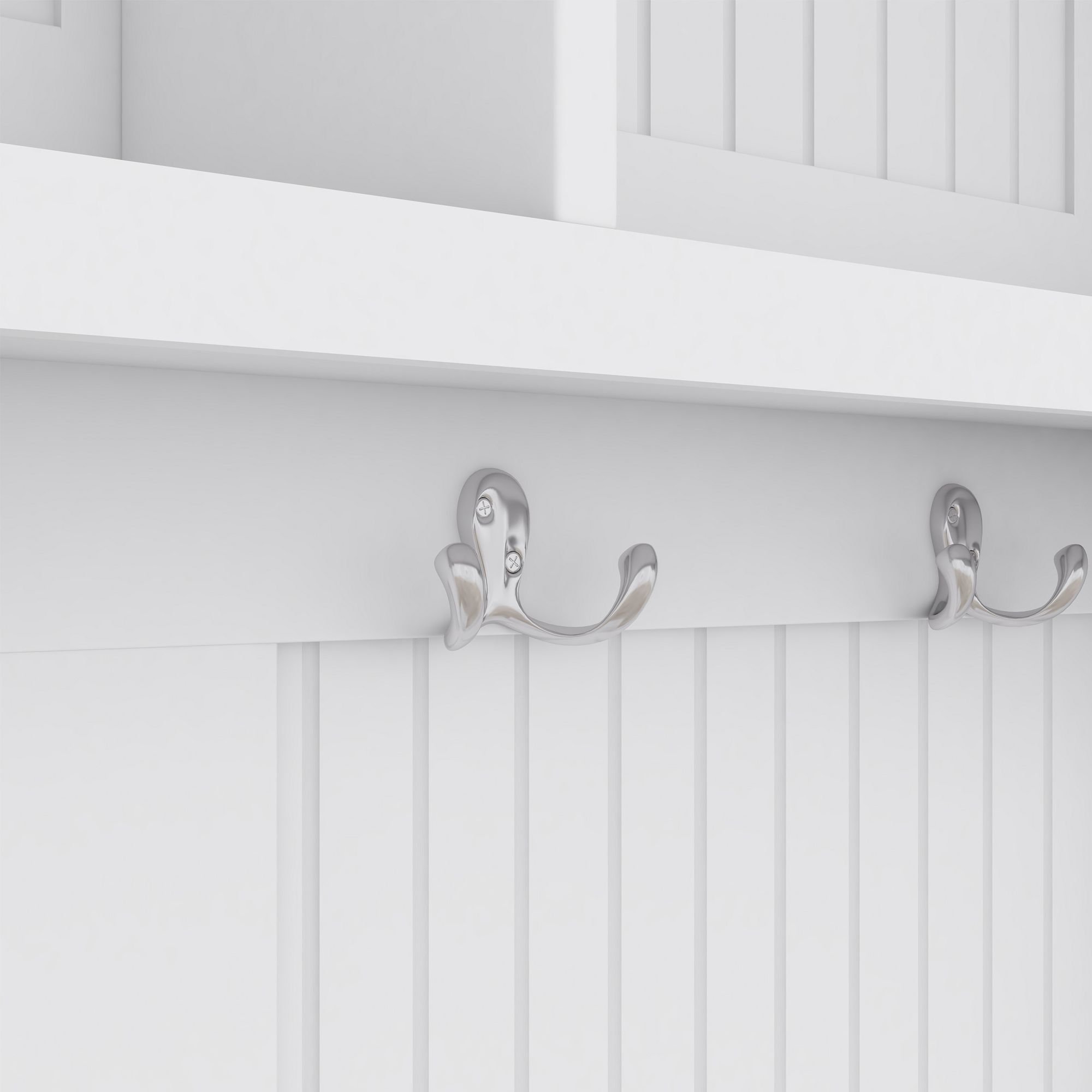 3.Ample Storage Space :Metal Double hooks are designed to hang your coat, hat, scarves, keys, bags, and so on. Two upper display shelves keep clutter at bay and lower storage cabinets can help store your shoes.