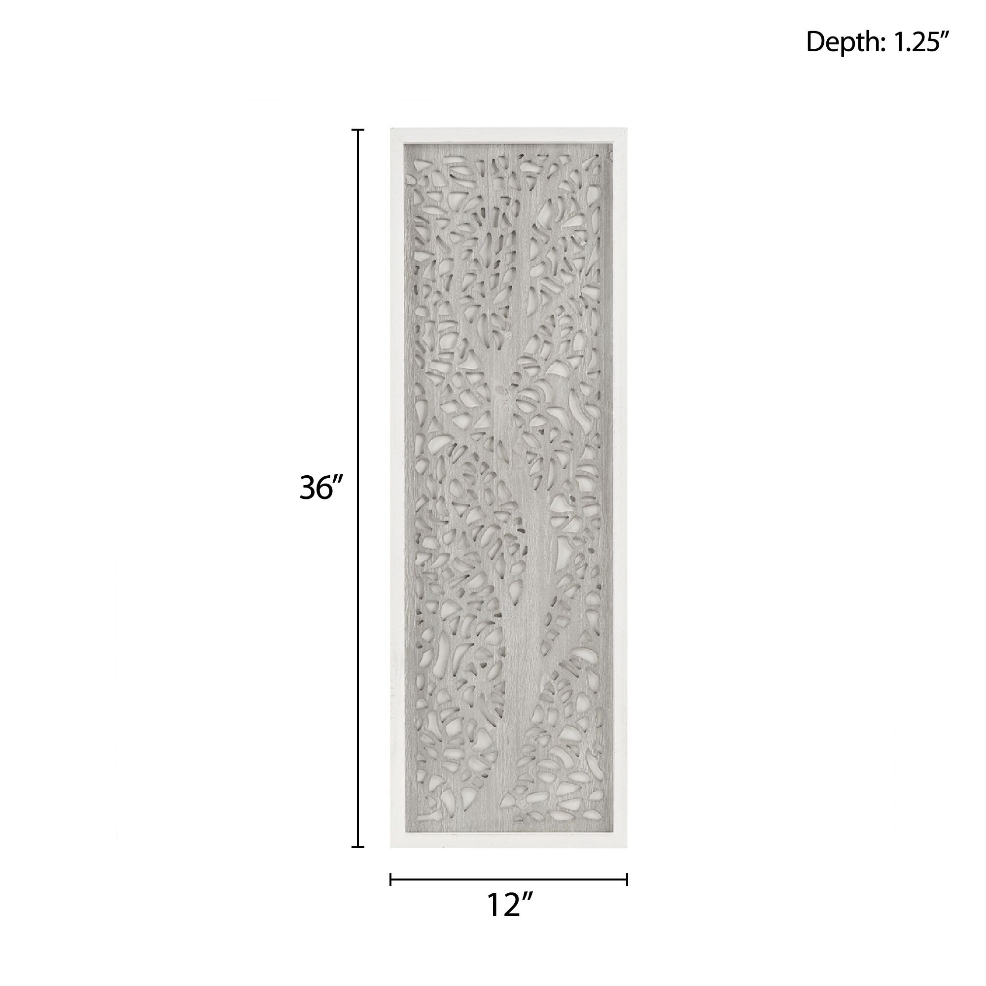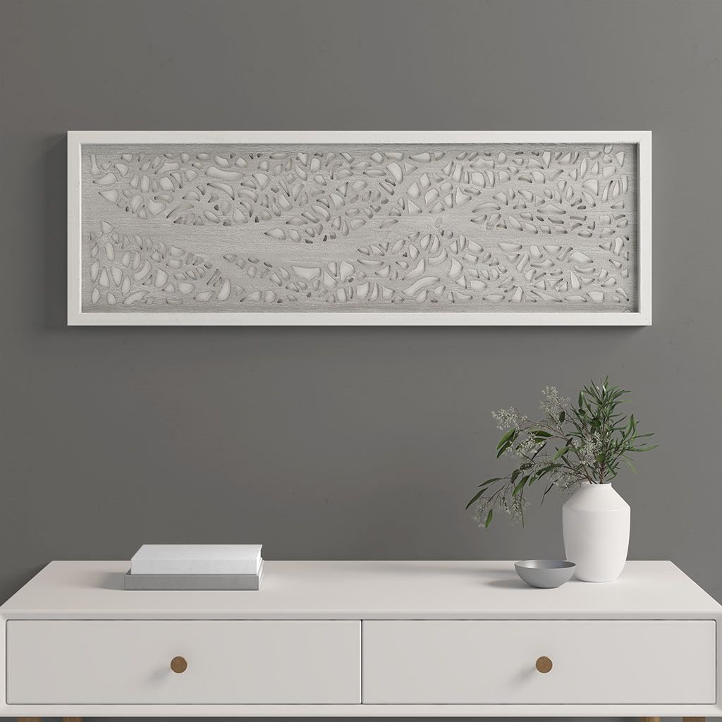 Revive your home with our Madison Park Laurel Branches Laser Cut Tree Framed Panel Wall Decor by Artist Emily Warne. This alternative wall art features a laser-cut MDF botanical branch design in a grey tone for a fresh and stylish touch, while the 100% fir wood frame features a whitewashed finish adding a natural and modern update. 4 D-rings are finished on the reverse allowing you to hang this piece both vertically or horizontally, making this beautiful botanical panel piece an easy addition to any room or decor. Measuring 12x36" and featuring 4 D-rings on the reverse, easily hang this piece both vertically or horizontally for a beautiful botanical addition to any room or decor.